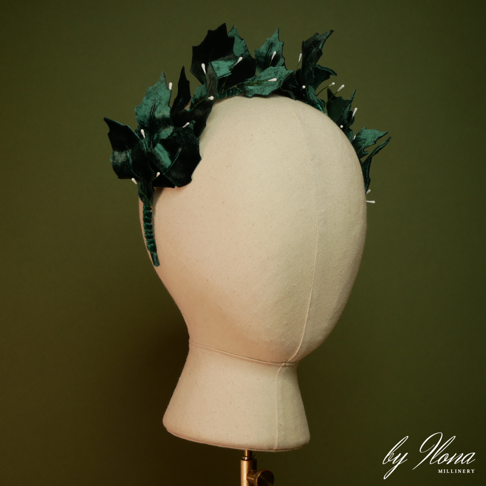 A tiara style headband adorned with beautiful hand made silk velvet leaves.