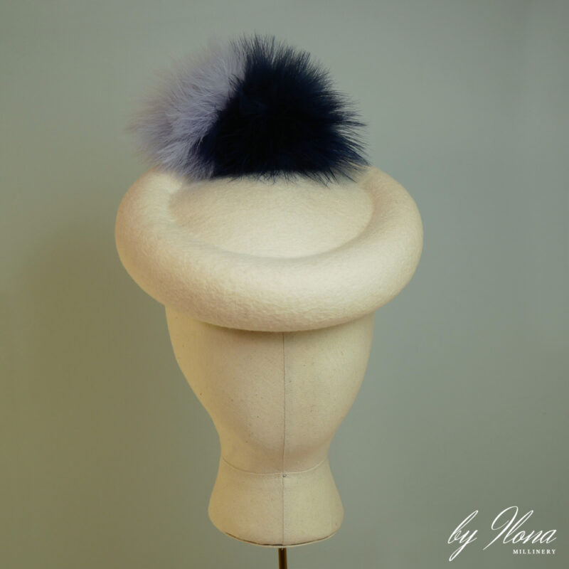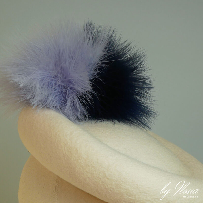 Pictured in an Off-White colour with Navy & Lilac feather pom pom pins.