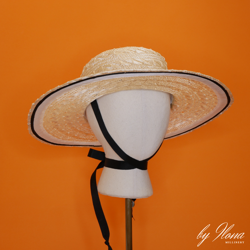 The Ribonette Boater is the perfect accessory for your summer adventures. Whether you are strolling in the park, sailing on the sea, or picnicking in the countryside, this hat will keep you cool and stylish. The Ribonette Boater is made from a cross knot ramie straw, a natural and durable material that breathes well and provides ample shade. The crown is trimmed with a striped black and white petersham ribbon which is mirrored on the underside of the brim creating a charming and playful look. The hat comes with black chin tie ribbons that can be worn to secure the hat on windy days, or hide the chin ties under the crown for a more modern look. Pair it with a floral dress, a denim jacket, or a swimsuit.